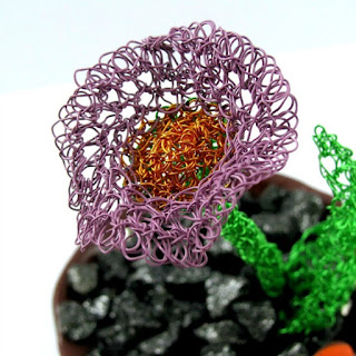 Wenn ihr denkt, daß es das war, denkt ihr falsch. Was ich an der Drahtstrickstruktur mag ist, daß man ein Stück biegen kann, falten, entfalten, und wenn man vorsichtig ist, kriegt der Draht auch keinen Knick und bricht nicht. Ihn zu dehnen ist nicht immer eine so tolle Idee, aber hier mußte ich ja nichts dehnen. Ich drückte den Boden des pinken Teils ein, ich zog ihn wieder heraus, ich drückte den Rand platt, ich machte Falten ... in anderen Worten, ich hatte Spaß.