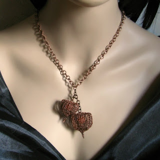 Also schnappte ich mir meinen Häkelhaken, strickte vier Lampionblumen in unterschiedlichen Größe und oxidierte das Kupfer für einen natürlicheren Look. Für meine ersten drei hatte ich einen beschichteten, nicht anlaufenden Kupferdraht benutzt und sie schienen mir immer etwas zu sehr zu glänzen. Schließlich bedeutet dieser filigrane Look, daß die Kapseln vertrocknet sind. Diese Skelettkapseln sind übrigens nicht immer gräulich, ich habe sie auch schon in bräunlichem Ton gesehen. Es ist auf jeden Fall ein schöner Anblick. Mutter Natur ist eine echte Künstlerin.